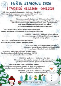 Szczegółowe informacje dostępne na stronie biblioteki https://slopnice.pl/pl/237/10485/nie-siedz-w-domu-spedz-ferie-z-biblioteka-.html oraz na załączonym poniżej plakacie: