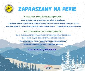 W okresie ferii małopolskich (2-13.02.2026 r.) Gorczański Park Narodowy w każdy wtorek i czwartek w Ośrodku Edukacyjnym GPN W Porębie Wielkiej i jego najbliższym otoczeniu organizuje cykl zajęć skierowanych do dzieci i młodzieży, m.in. warsztaty, prelekcje, pokazy filmów oraz spacery przyrodnicze: