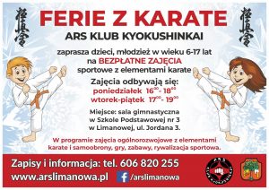 W okresie ferii zimowych, ARS Limanowa zaprasza dzieci i młodzież z limanowskich szkół na nieodpłatne treningi sportowe realizowane w ramach autorskiego programu „Ferie z karate”, który prowadzony jest nieprzerwanie od początku działalności klubu.