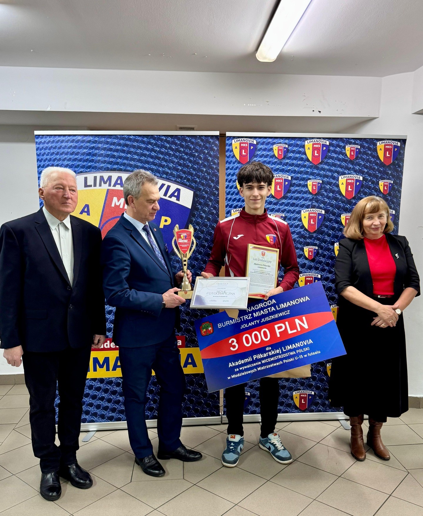 Z okazji tego historycznego sukcesu, w siedzibie Limanowskiego Podokręgu Piłki Nożnej pamiątkowe listy gratulacyjne oraz nagrody finansowe dla Akademii Piłkarskiej Limanovia – w obecności młodych zawodników, ich trenerów oraz przedstawicieli zarządu klubu wręczyli Burmistrz Miasta Limanowa Jolanta Juszkiewicz oraz Starosta Limanowski Mieczysław Uryga. Jest to wyraz uznania dla sportowej postawy, determinacji i talentu popartego wytrwałą pracą: