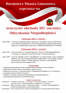 11 listopada 2025 r. Polska świętuje 107. Rocznicę Odzyskania Niepodległości. W tym dniu, również w miastach i gminach Powiatu Limanowskiego organizowane będą uroczystości oraz wydarzenia towarzyszące.