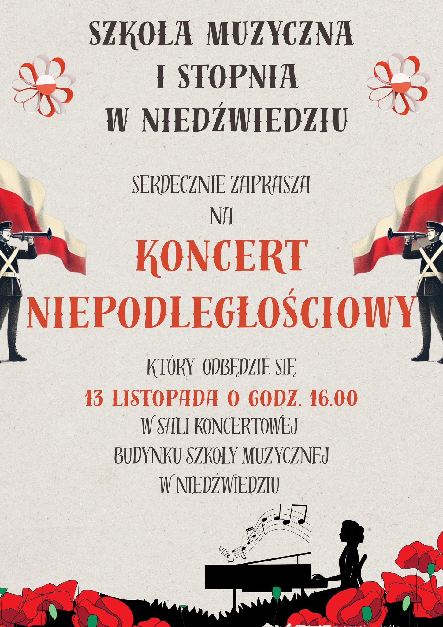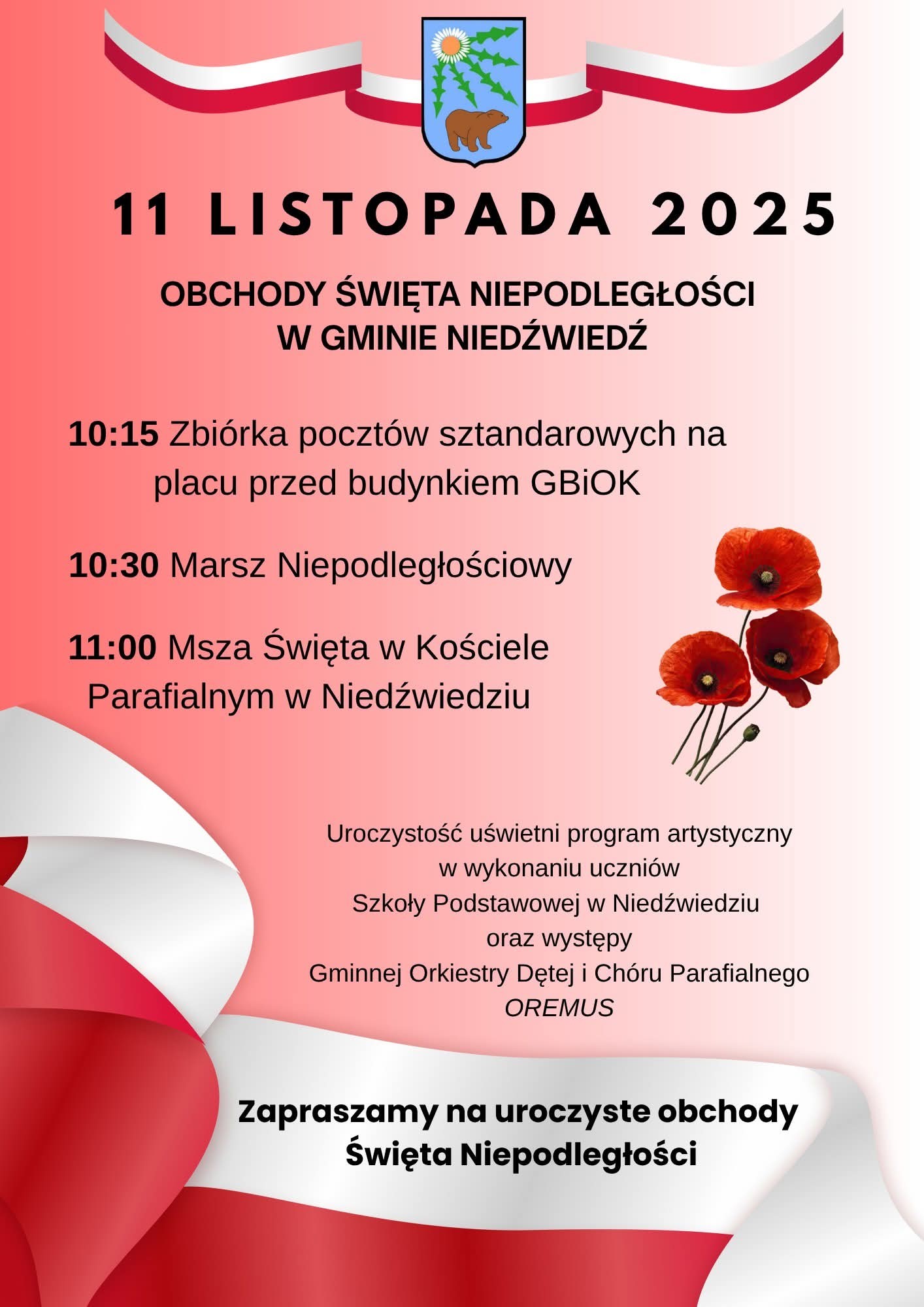 3. Gmina Niedźwiedź uczci rocznicę odzyskania Niepodległości przez Polskę mszą świętą w kościele parafialnym o godz. 11:00). Uroczystość uświetni program artystyczny przygotowany przez uczniów Szkoły podstawowej w Niedźwiedziu oraz występ Chóru Parafialnego „Oremus”.