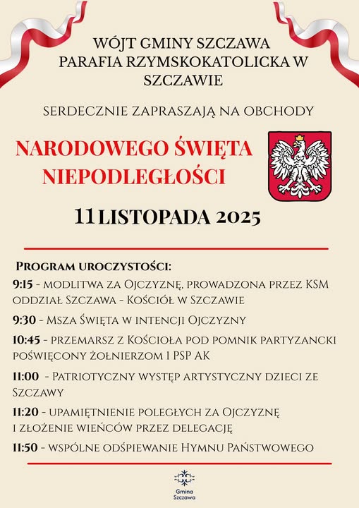 7. Program uroczystości Narodowego Święta niepodległości 11 listopada 2025 w gminie Szczawa
