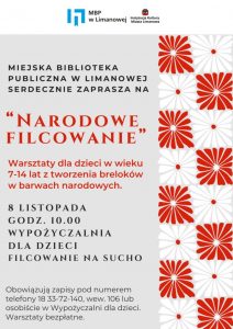 - 8 listopada Miejska Biblioteka Publiczna w Limanowej serdecznie zaprasza dzieci w wieku 7–14 lat na wyjątkowe warsztaty z filcowania na sucho pod hasłem „Narodowe filcowanie”.