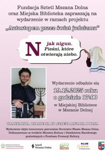 Fundacja Sztetl Mszana Dolna zaprasza 19 grudnia 2025 o godz. 17:00 do Miejskiej Biblioteki (ul. Piłsudskiego 58a) na koncert pieśni – nigun, które – wedle mistycznej myśli chasydzkiej – otwierają niebo. Spotkanie: wykład połączony z prezentacją tych modlitewnych perełek muzycznych, poprowadzi Jakub Antosz-Rekucki, specjalista od poezji mellicznej i pasjonat żydowskich pieśni. Artysta zaprosi tez publiczność do wspólnego śpiewu.