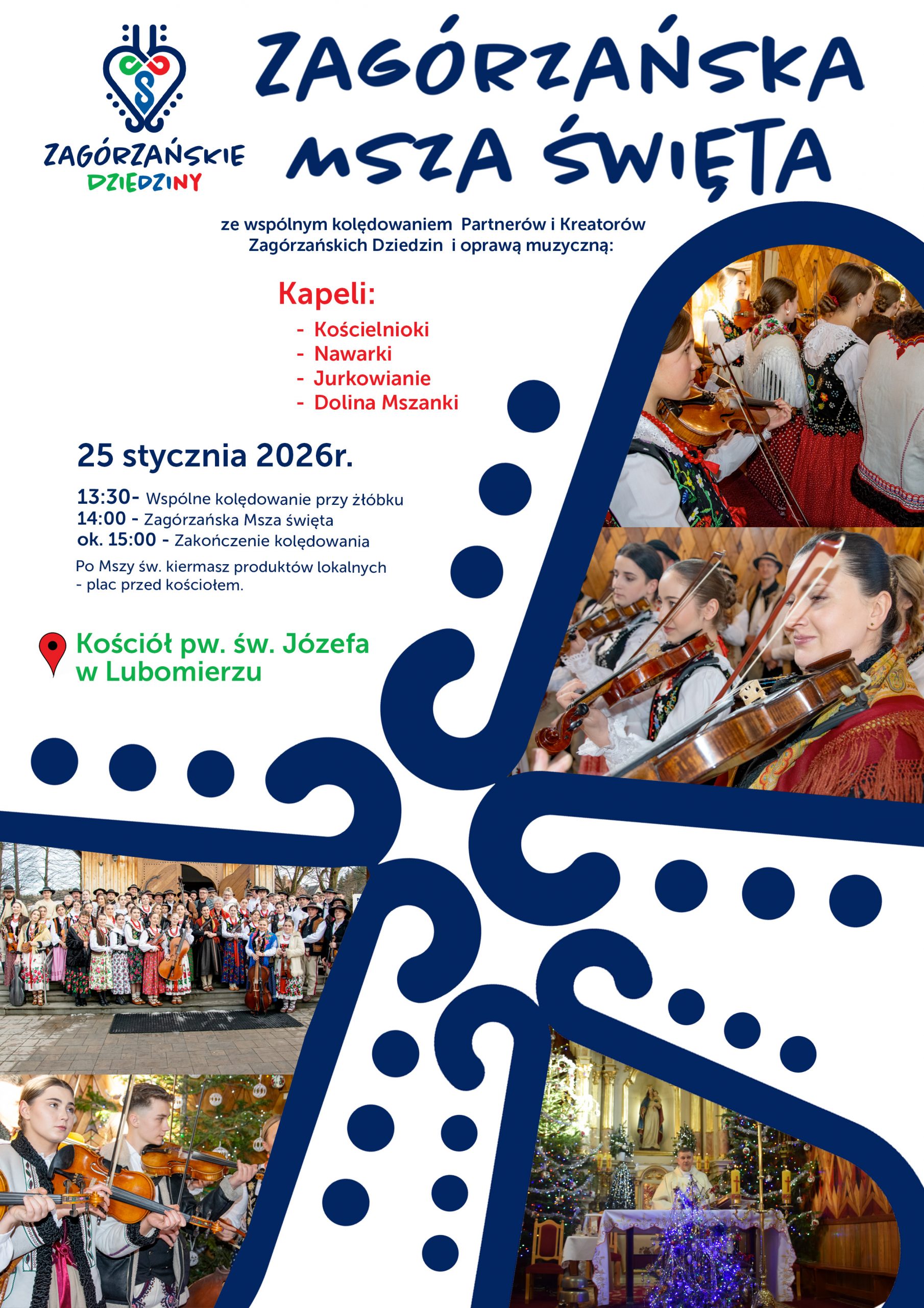 25 stycznia 2026 r., o godz. 14:00, w kościele p.w. św. Józefa w Lubomierzu, odprawiona zostanie Zagórzańska Msza św. Wyjątkowo, spotykamy się jednak pół godziny wcześniej, bowiem od 13:30 będziemy wspólnie kolędować przy żłóbku. Nie będzie więc okolicznościowego koncertu na placu przed kościołem.