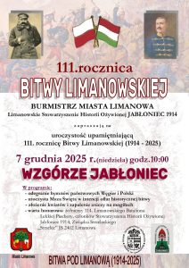 Burmistrz Miasta Limanowa oraz Limanowskie Stowarzyszenie Historii Ożywionej Jabłoniec 1914 zapraszają mieszkańców i gości na uroczystość upamiętniającą 111. rocznicę Bitwy pod Limanową.